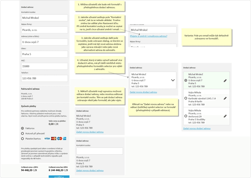 Wireframe různých stavů pro zadávání dodacích údajů.