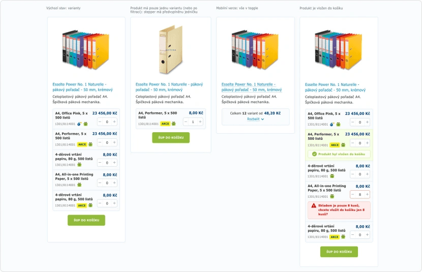 Pracím na hlavním e-shopu předcházely redesigny menších koncových e-shopů, na kterých jsme měli možnost si spolupráci se společností Picards vyzkoušet. Bez obav jsme si ji vybrali i pro redesign našeho největšího e-shopu. Hned v počátku se ukázalo, že tento projekt bude daleko náročnější, než byly předchozí, a to hlavně z důvodů velké variability našeho řešení a tudíž velkého množství objednacích scénářů. Pan Michal Mrskoč ale všechny informace dokázal „nasát“ a vytvořit takové wireframy, které zefektivnily nakupování kancelářských potřeb pro všechny naše zákazníky.