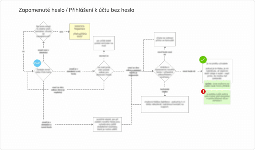 Původní zdlouhavý proces obnovy hesla byl jedním z největších problémů původního webu. Proces obsahoval zbytečné kroky a zmatené hlášky, které oddalovaly přihlášení uživatele. Proto jsme tento proces nejdříve zdokumentovali a pak v přehledném schémátku navrhli jeho zlepšní. Bohužel vám ho můžeme ukázat pouze takto rozmazaný, protože je to interní informace